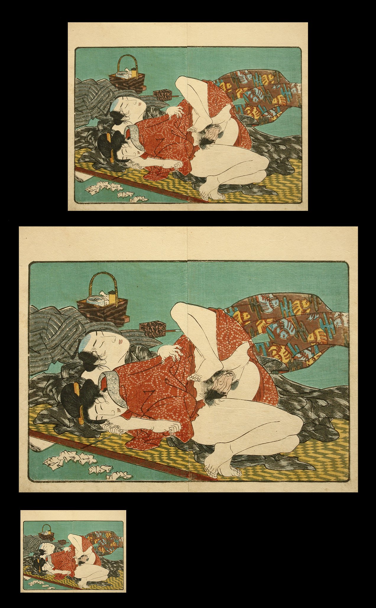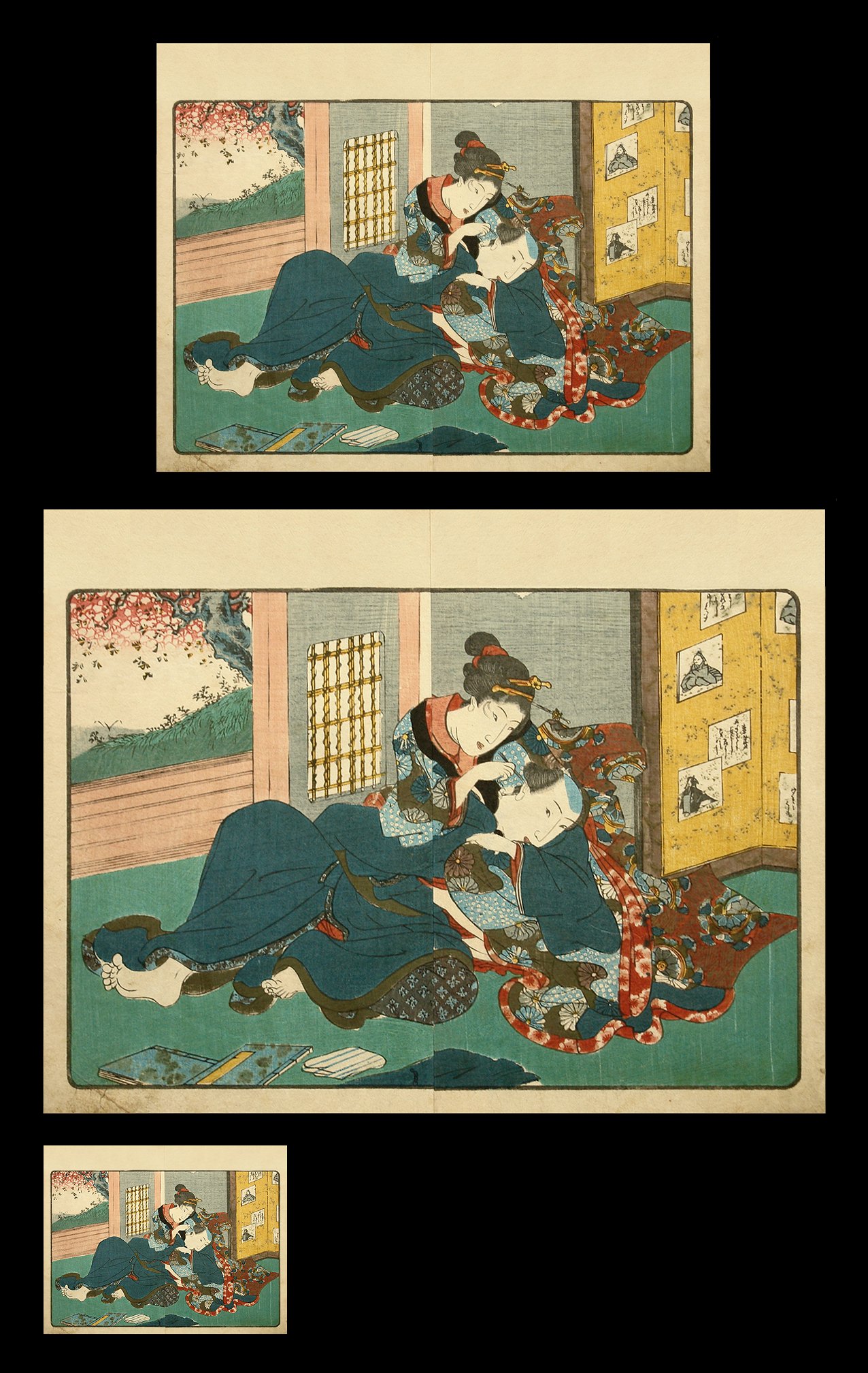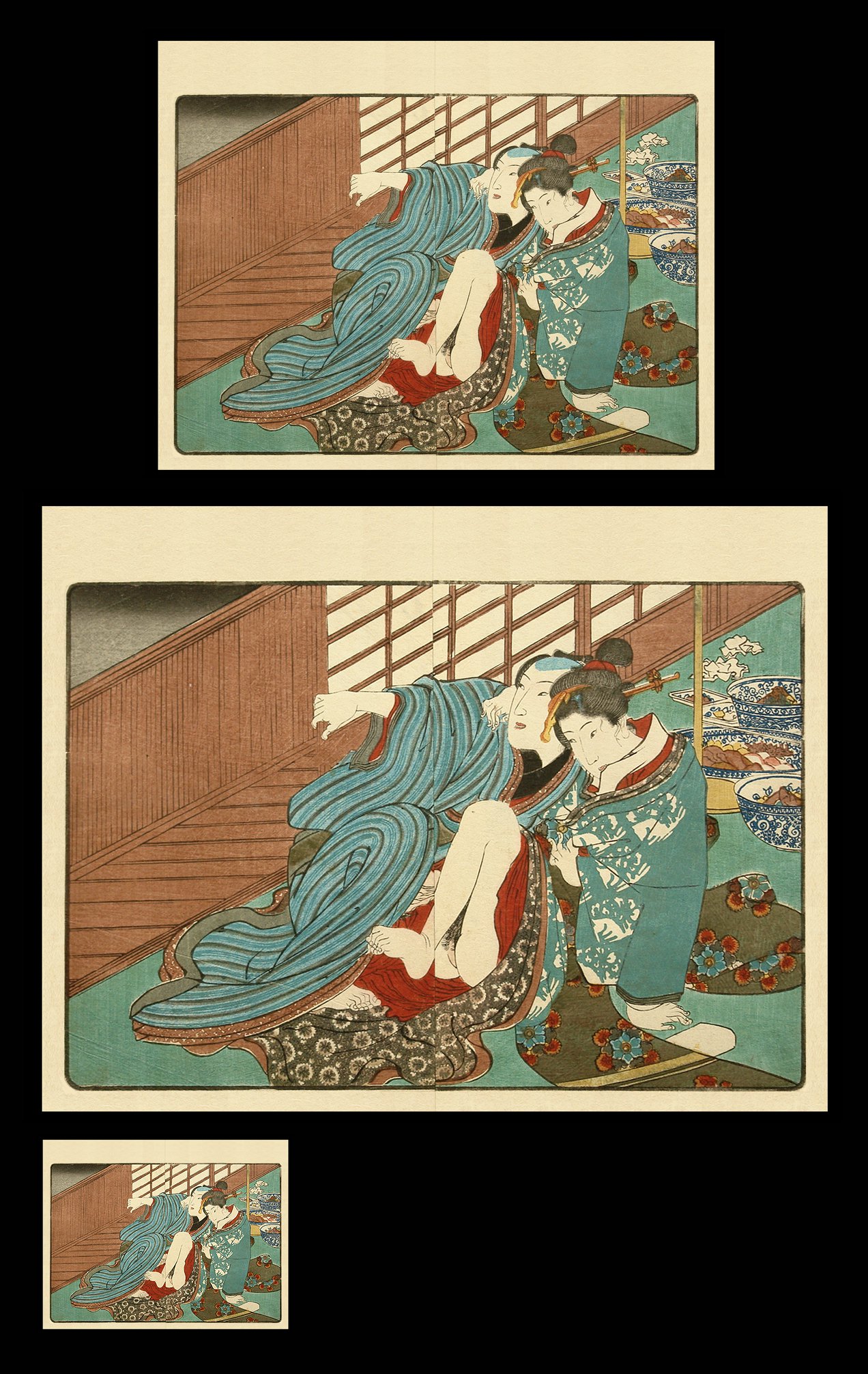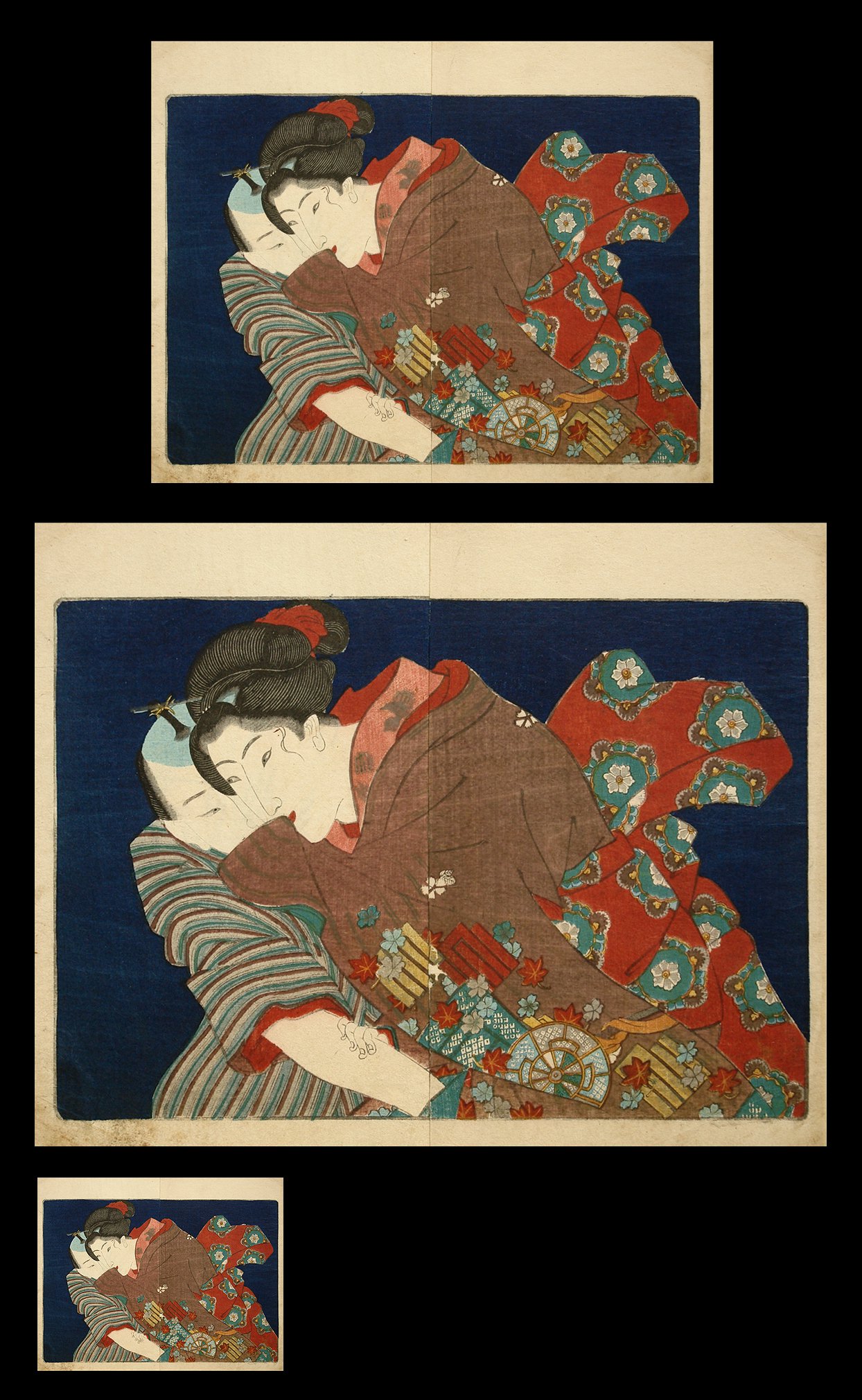 Hiroshige – Kuniyoshi – Masterful Close Up Design – Embracing Lovers – c.1838. |
