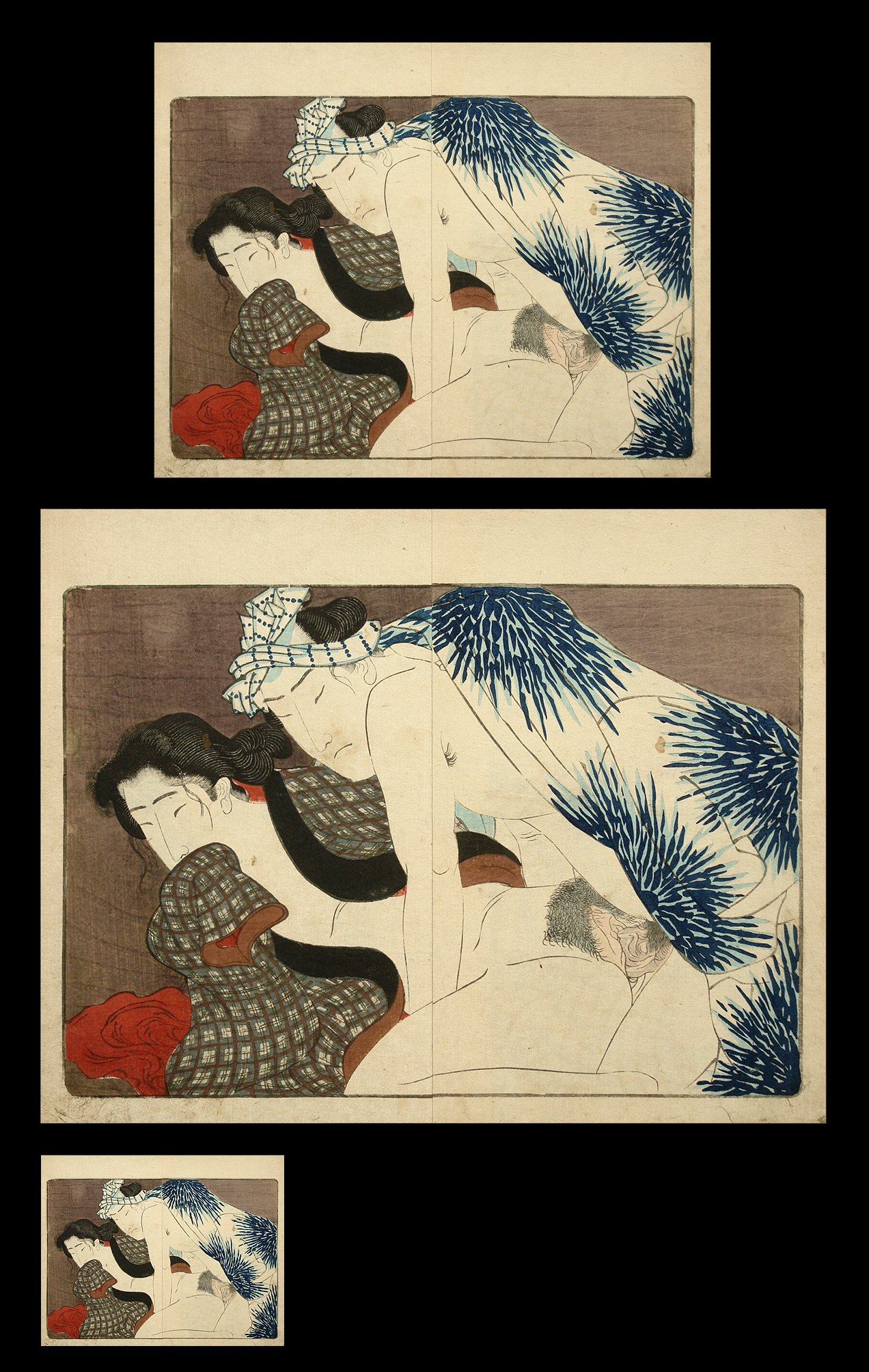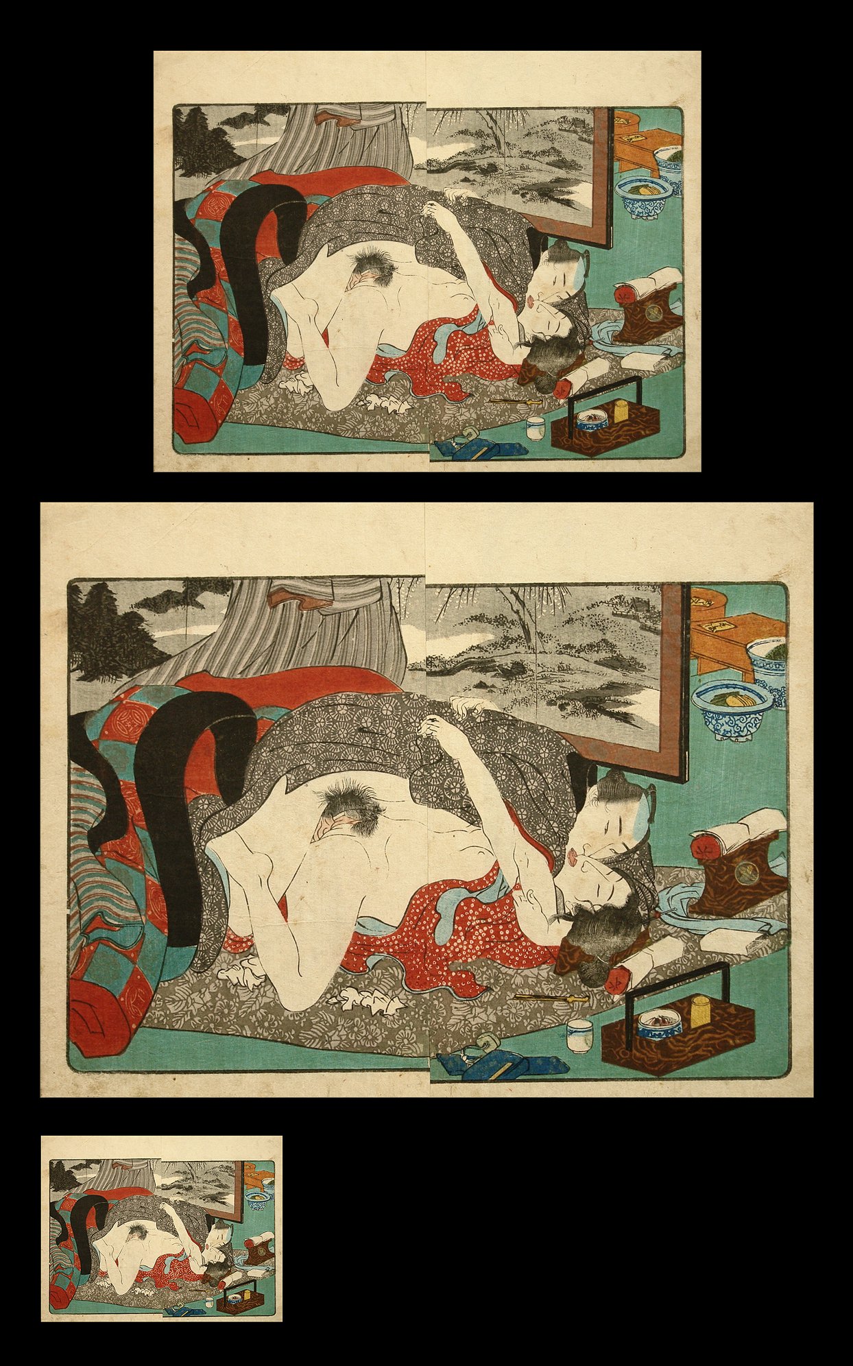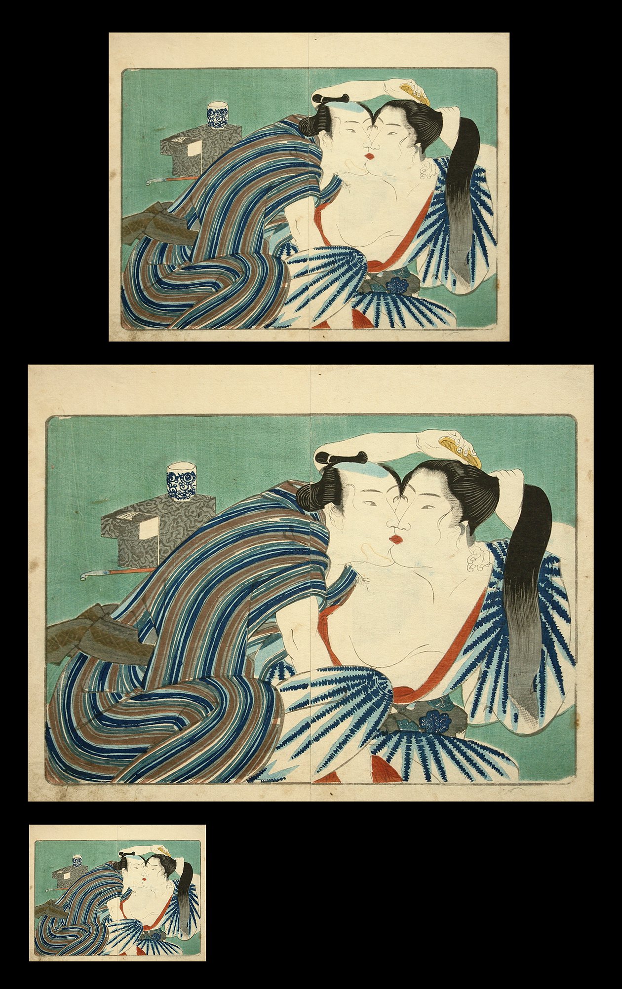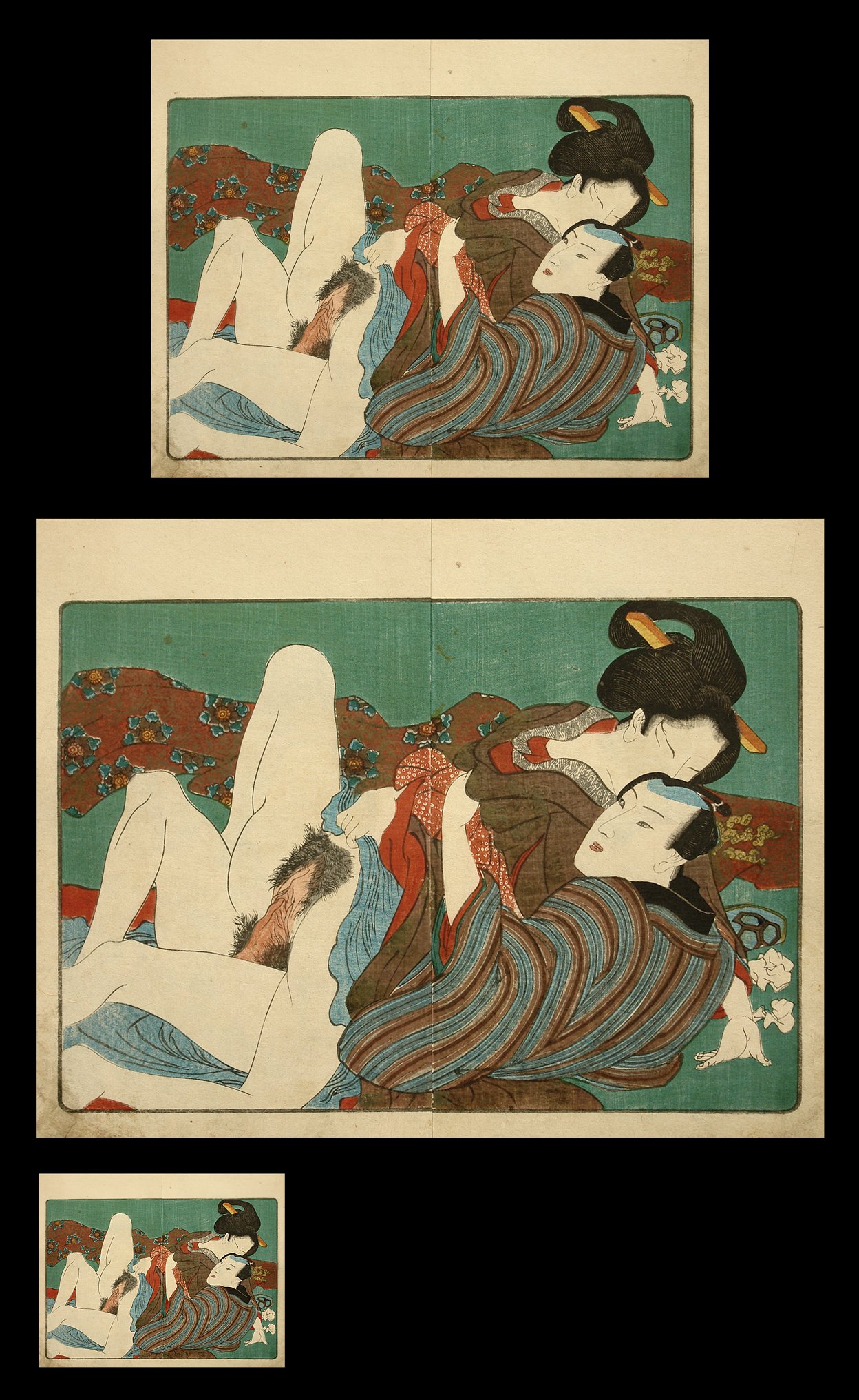 Hiroshige – Kuniyoshi – Masterful Close Up Design – Embracing Lovers – c.1838. |