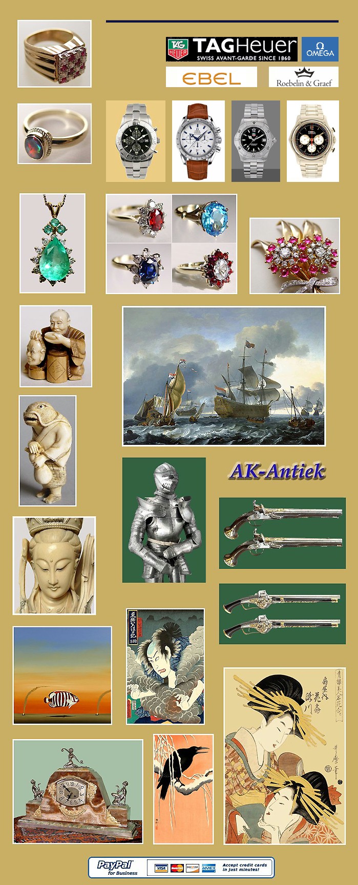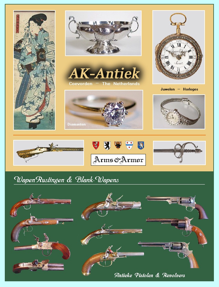Ivoor ( Ivory ) - Netsuke - Inro - Ojime - Okimono. Japan / China - Porselein / Aardewerk. Satsuma - Kutani etc. Antieke Sieraden & Juwelen. Goud - Zilver - Diamanten - Briljanten etc. >> Sieraden & Juwelen met Edelstenen - Diamanten & Briljanten. Antieke Zilveren voorwerpen. "Art Deco" Glas & Kristal. >> Antieke Wapens. etc....