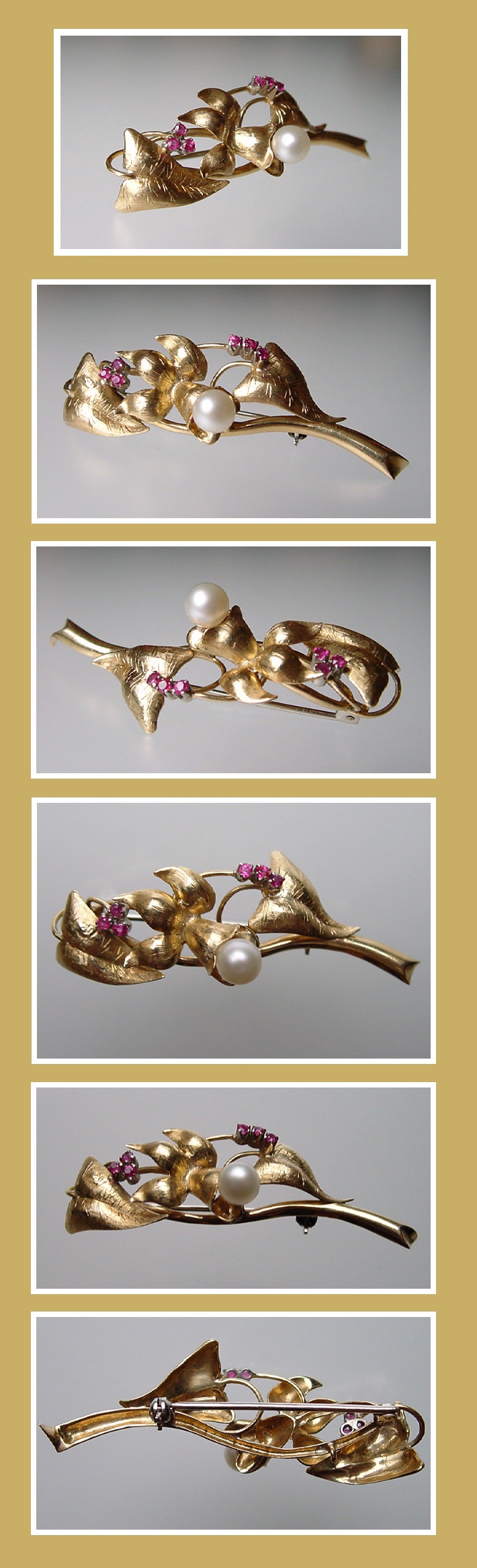 Prachtige 18K.Gouden Broche bezet met een cultivé parel en zes Robijntjes.