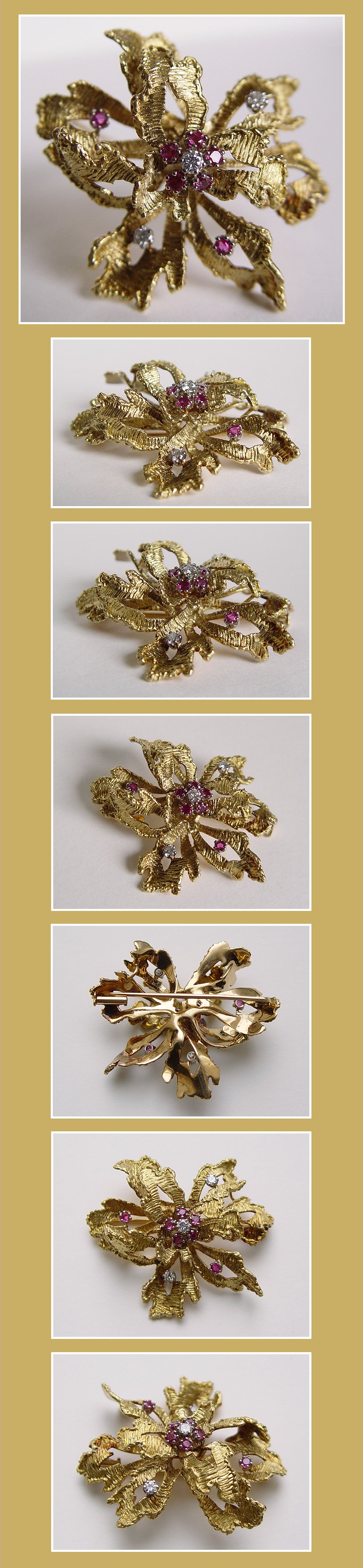 Unieke Top Kwaliteit 18K. Gouden Broche Met Diamanten en Robijnen.