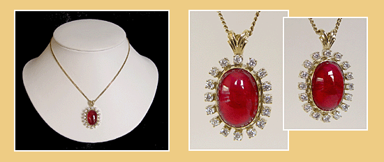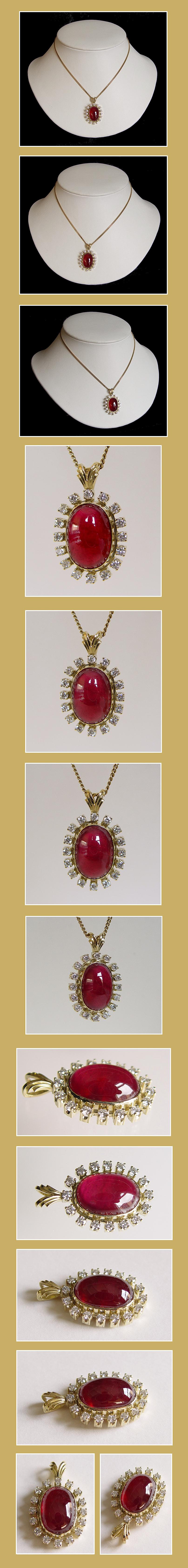 Prachtige Unieke 14K Gouden Hanger bezet met een Zeer Grote Cabochon geslepen Robijn en 16 Diamanten.